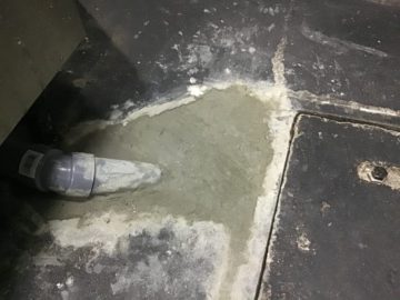割石など配管の周りに入れてインスタントセメントを流し込んで完成。冷蔵庫の下、少しはみ出す程度で治まりました。営業中水漏れとかしてくると料理に集中出来なくなるのでこれで安心ですね。