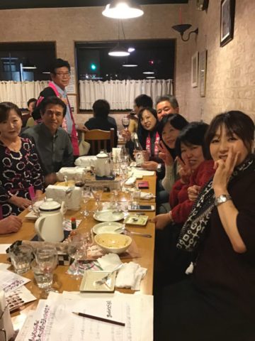 日曜日のディナータイムは貸し切りで、酒屋さんがボジョレーヌーヴォーのイベントで使ってくれました。料理は、サラダ、スープ、前菜盛り合わせ、チキンの煮込み、パスタ、ピザ、最後にデザートのコース。ワインに関するクイズ大会など終始楽しそうな会でした。